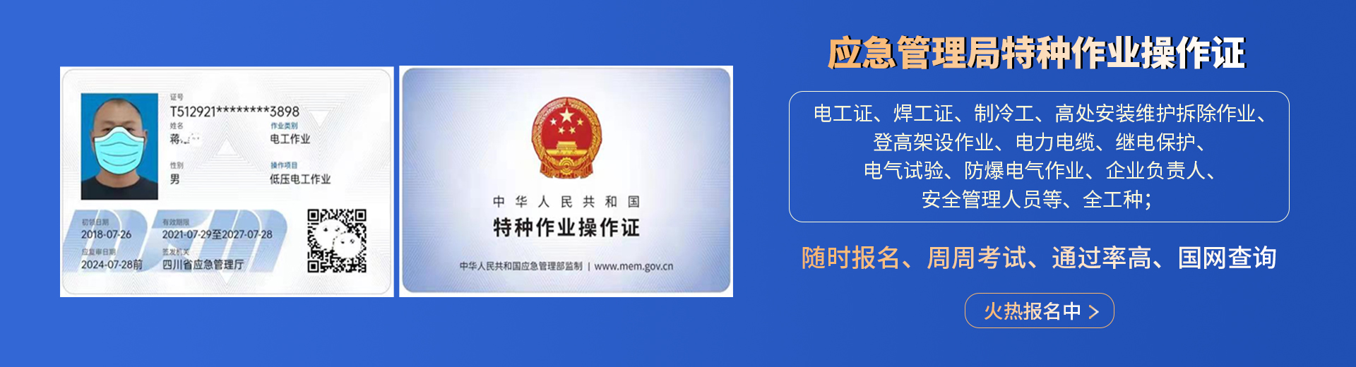 電工證,焊工證,登高架設(shè)證,高處安裝維護(hù)拆除證,電力電纜證,繼電保護(hù)證,電氣實(shí)驗(yàn)證,防爆電器作業(yè)證,制冷工證,主要負(fù)責(zé)人證,安全管理人員證
